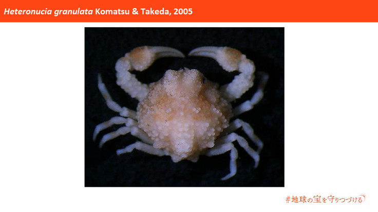 小松:私はコブシガニの分類を主に研究していますが、難点がありまして...とても小さいというところです。奄美大島の沖、水深200mくらいのところで採った「Heteronucia granulata」というカニ(下画像)は甲長4mmぐらいしかありません。