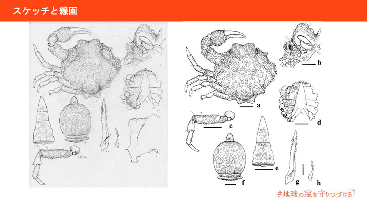 小松:はい。新種を記載するときには、解剖してスケッチをします。カニは口部付属肢(こうぶふぞくし)といって口のところに6対の脚があるのですが、それも解剖してそれぞれスケッチをするんです。コブシガニはとても小さいので、これがなかなか難儀なことでして。解剖は、解剖針(かいぼうばり)という道具で突いて付属肢を外していきます。針のサイズは10マイクロとか、とても先の尖ったものですが、画面越しだと......