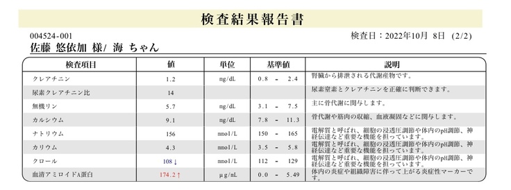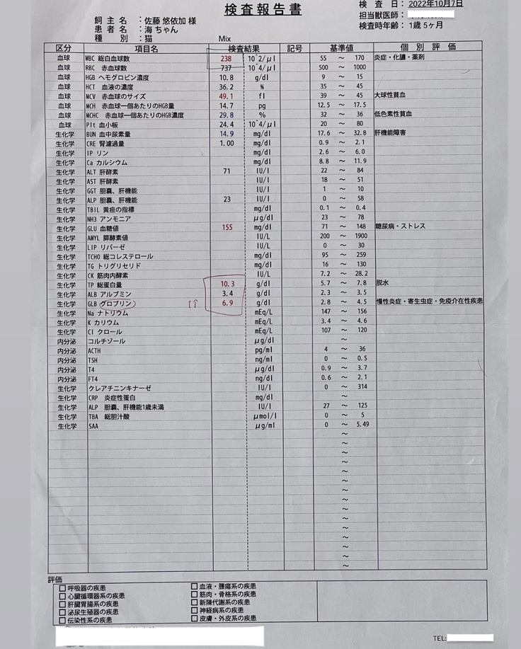 FIP協力病院の1週間検診時のものです。初診時同様に1週間分の治療薬をいただき、肝機能に問題があるとのことだったので、そちらも薬も処方されました。その他の数値については、当初よりも良くなっているものも多く一安心しました。