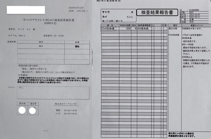 検査結果が届き、FIPであると診断されました。今は寛解を目指して、投薬治療を継続しています。