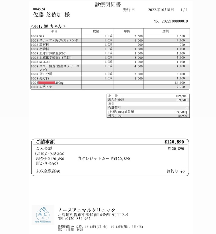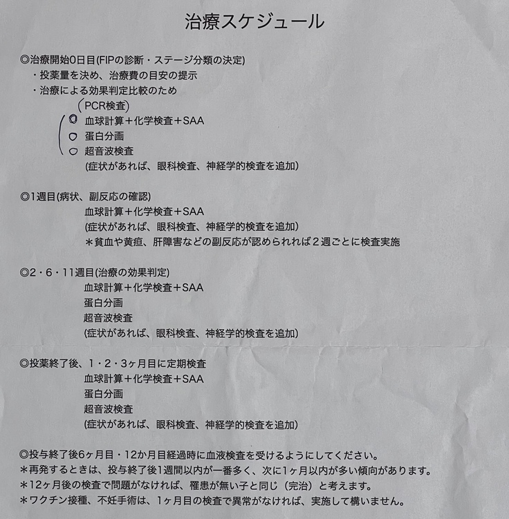 病院で様々な検査をした結果、やはりFIPの可能性が高いと診断され、直ぐに薬を出しても良いよと言って頂き、薬のルール、費用、説明を受け処方して頂きました。