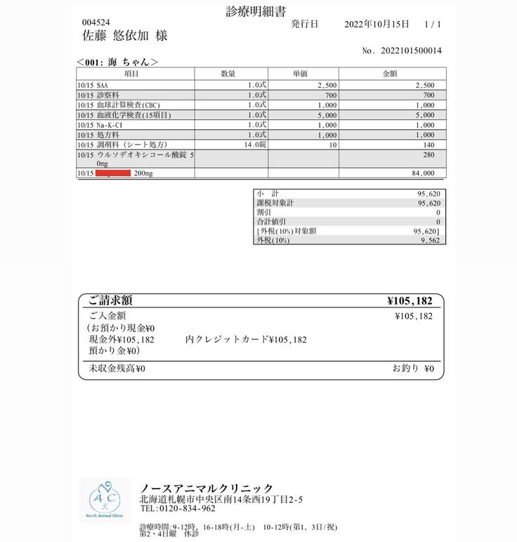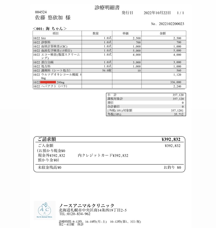 体重が増えるに従って投薬量も増えるため、概算になりますが、最低でも1,200,000円が寛解までにかかる見込みです。