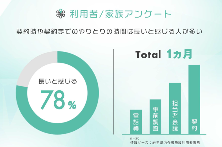 事前の調査結果では、利用者家族の実に78%の方が契約時や契約までのやりとりが長いと感じているという実態を把握できました。また、施設関係者においては1件あたり契約にかかる時間が7時間削減できるなら、なんと95%の経営者の方から「介護クラウド」をぜひ導入したいという回答を得ました。