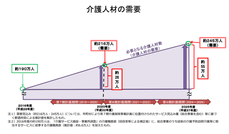 以下グラフを見てもお分かりのとおり、今後約5年間で29万人もの介護人材が不足すると見込まれており、ますます人材不足が顕著になっていると考えます。