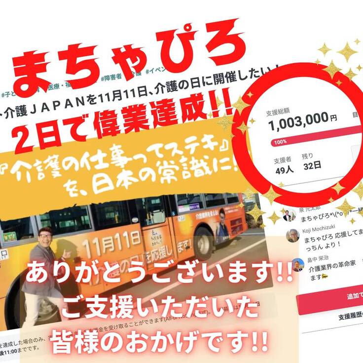 ご支援も、もちろんですが、寄せられる温かい応援メッセージが私達の大きな励みとなっておりました。本当にありがとうございました。多くの期待を改めて自覚し、最幸の【介護の日】イベントにすべく【第1回 ベスト 介護 JAPAN】 を盛大に執り行えるように全力を尽くしていきたいと思います。