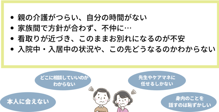 このような悩みを抱えていても、どこに相談していいのかわからなかったり、プライベートなことを話すのが恥ずかしい、あるいは担当してくれている医師やケアマネなどに迷惑をかけるのではないか、と声に出さない方も非常に多くいらっしゃいます。