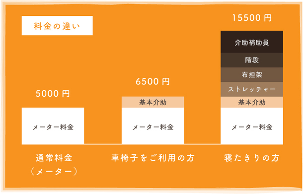 メーターの料金は約5000円。このお客様が、車椅子の場合なら、これに基本介助として1000~1500円プラス程度で、あまり大きな差は出ません。しかし、寝たきりの方と仮定して、階段が10段あるご自宅にお送りするとなりますと、メーター5000円+基本介助1500円+ストレッチャー2000円+布担架2000円+階段2000円(階段5段に付き1000円の会社)+介助補助員3000円(ストレッチャーの場合、必ず2名体制の為)=15500円となるのです。