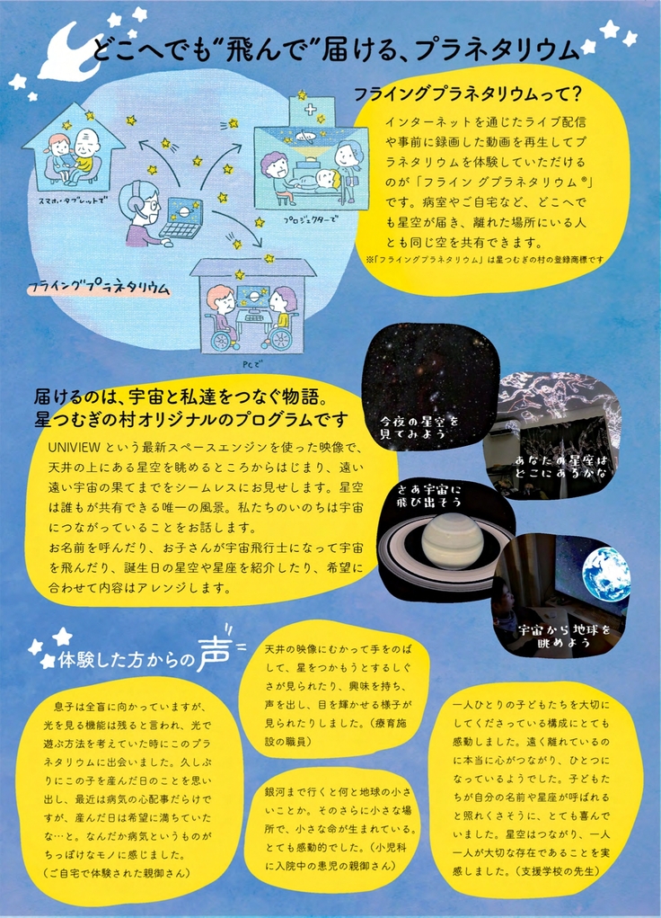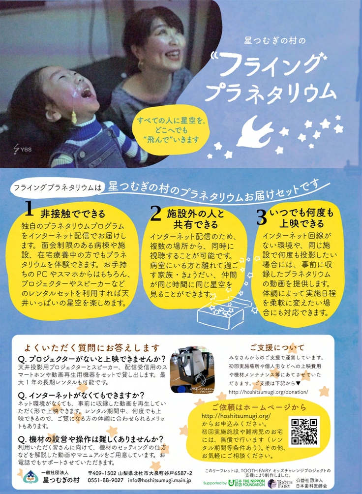 山梨県の一般社団法人 星つむぎの村さまが、「フライングプラネタリウム」という、プロジェクターを活用してどこでもプラネタリウムを体験してもらおうという企画を行われています。