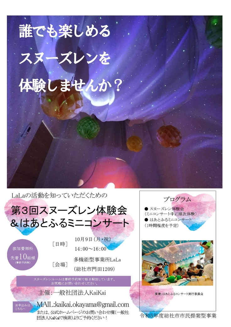 スヌーズレン体験会とミニコンサートを通じて、LaLaの活動を知って頂く機会となればと思います。