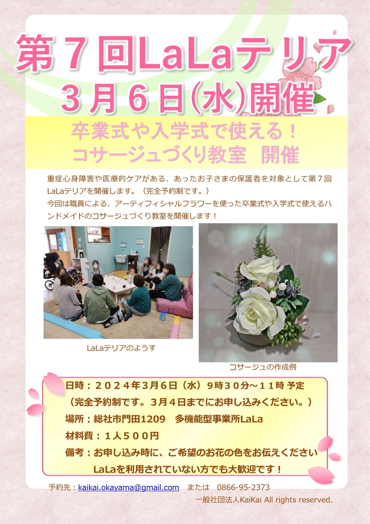 【第7回LaLaテリア】3月6日(水)に、卒業式や入学式で使えるコサージュづくり教室を開催します!