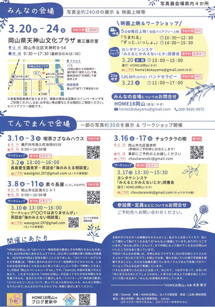 2024/3/1-2024/3/24まで開催される、「18トリソミーの子どもたち写真展 岡山スペシャルニーズVer.」についてのお知らせです。