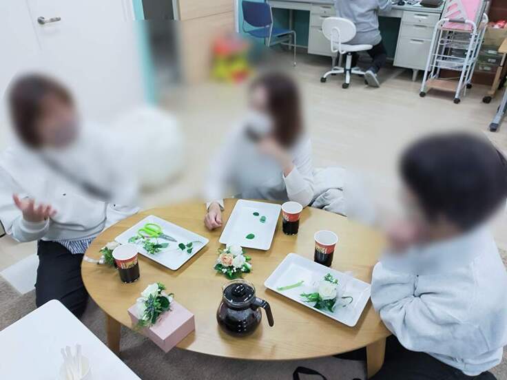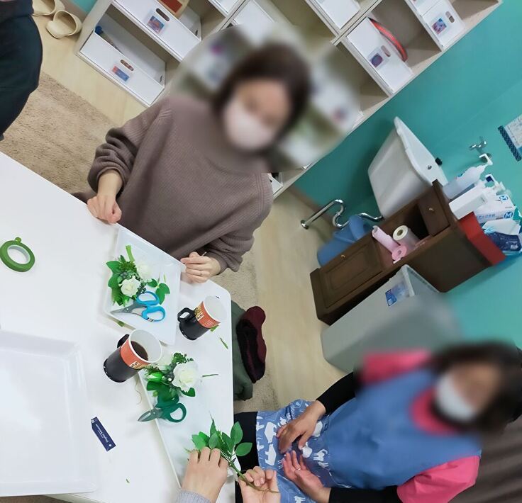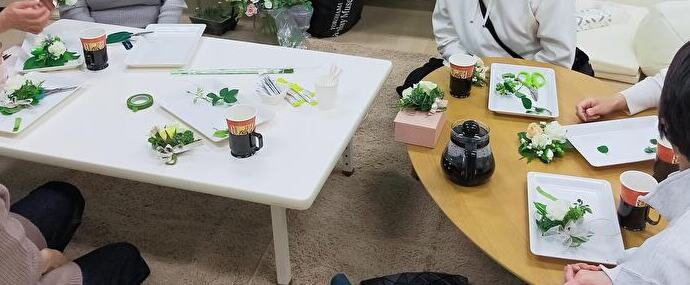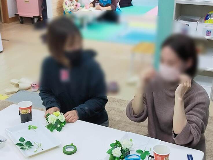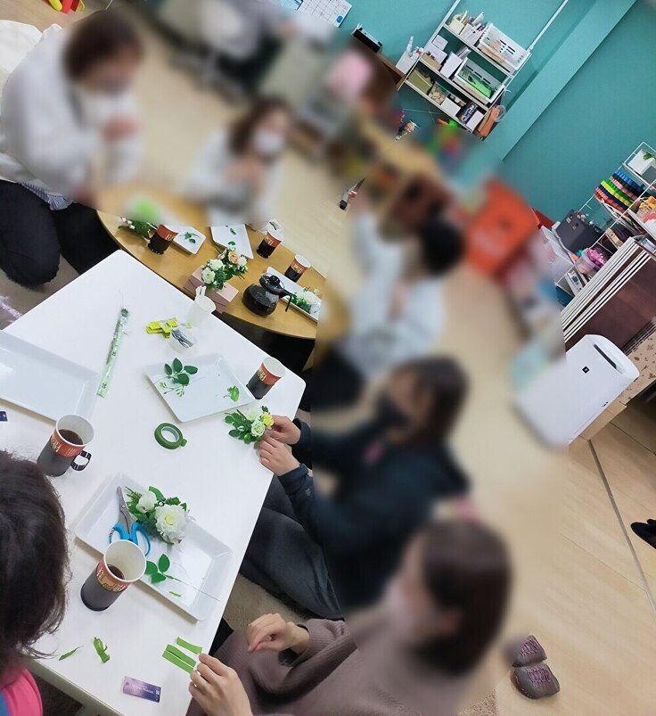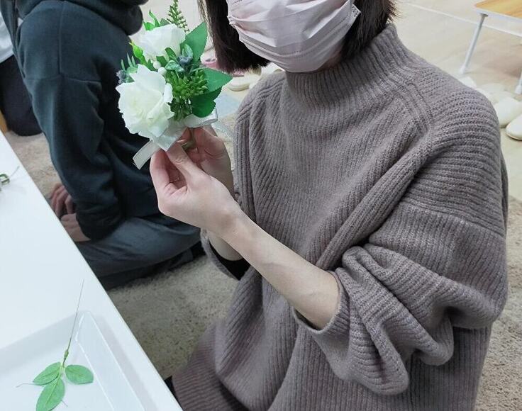 スタッフが講師となって、保護者の皆さまにお集まりいただき、卒園式や卒業式で使えるアーティシャルフラワーを使ったコサージュづくりを開催しました。