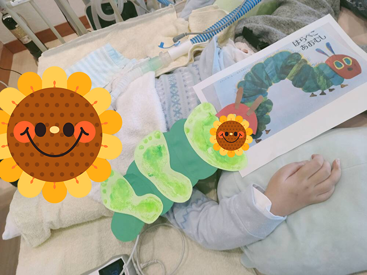 今週は手や足を水性のスタンプ台に押して手形や足形をつくって、オリジナルのはらぺこあおむしを作っています。