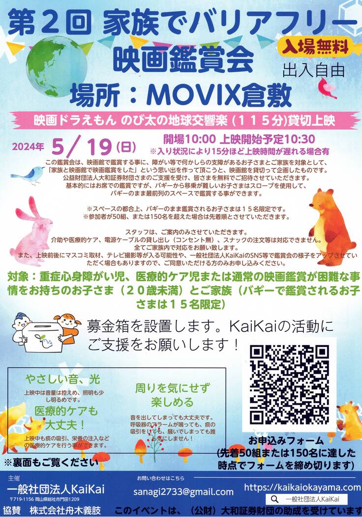 2024/5/19(日)に、MOVIX倉敷のスクリーンを貸切って、岡山県内の重症心身障害児、医療的ケア児、または何かしらの事情で通常の映画館での映画鑑賞に支障があるお子さまとそのご家族を対象とした映画鑑賞会第2弾を開催します!