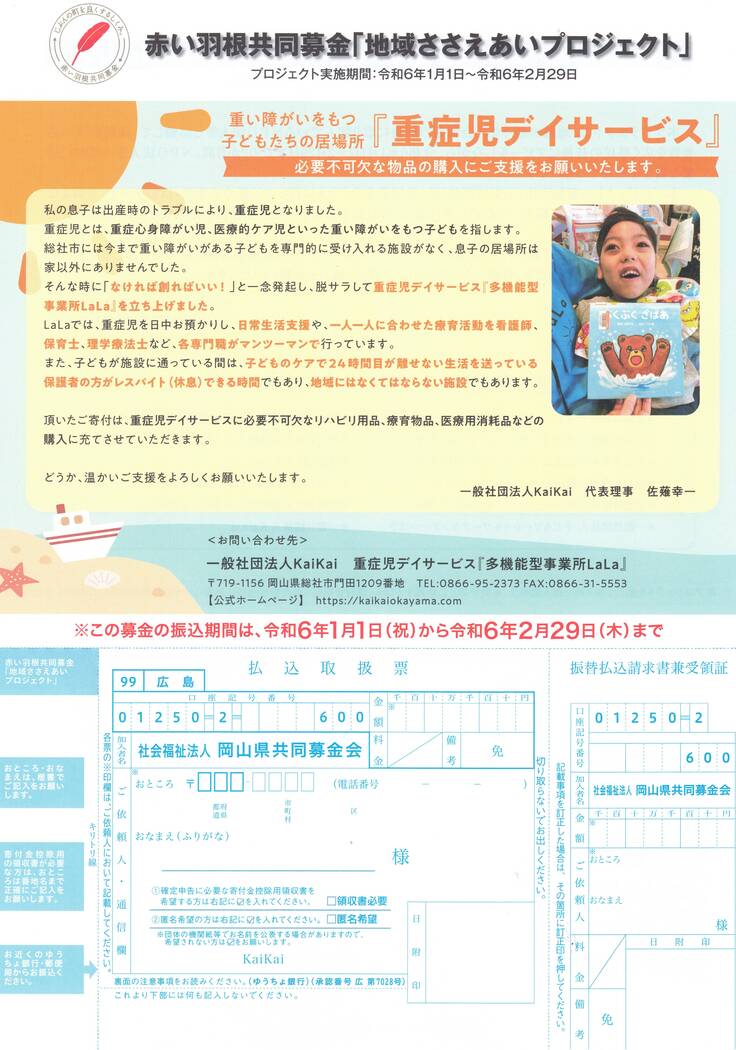 一般社団法人KaiKai専用のチラシに付いている払い込み用紙を用いて、お近くのゆうちょ銀行・郵便局からご寄付頂きますと、寄付額に応じてを赤い羽根共同募金さまから上乗せされて、一般社団法人KaiKaiにご寄付いただけるという仕組みのプロジェクトです。