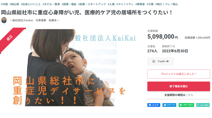 息子をはじめ地域で重い障がいがある子どもたちの居場所を創りたい!と一念発起し、2022年6月末まで、READYFORで『岡山県総社市に重症心身障がい児、医療的ケア児の居場所をつくりたい!』というプロジェクトを実施させていただきました。