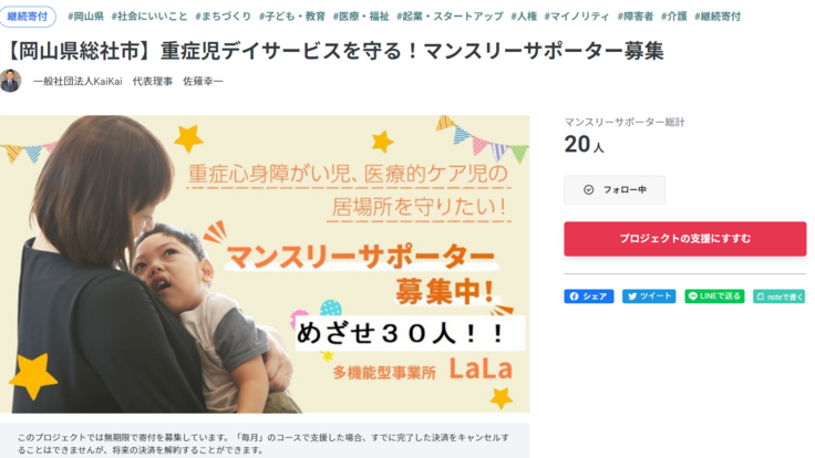 妻と重症心身障がい児の長男と双子の次男、長女の子育てをしながら岡山県総社市初の重症児デイサービス『多機能型事業所LaLa』を運営しています。 プロジェクトに関するご質問、求人のお問い合わせ等、お気軽にお問い合わせください。 kaikai.okayama@gmail.com