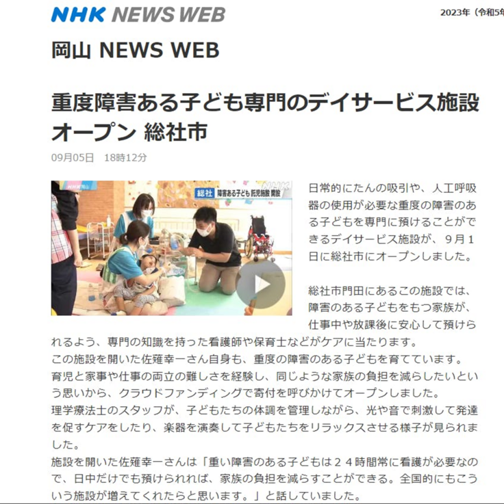 ご支援が無ければ重症児デイサービスを開設する事が出来ませんでした。ご支援いただき誠にありがとうございました。