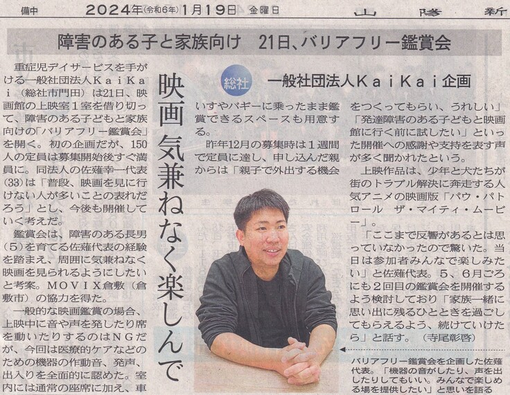 【家族でバリアフリー映画鑑賞会】山陽新聞さまの朝刊に掲載されました!