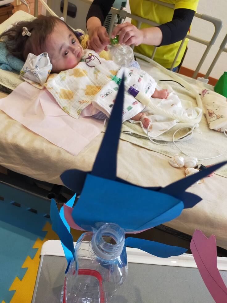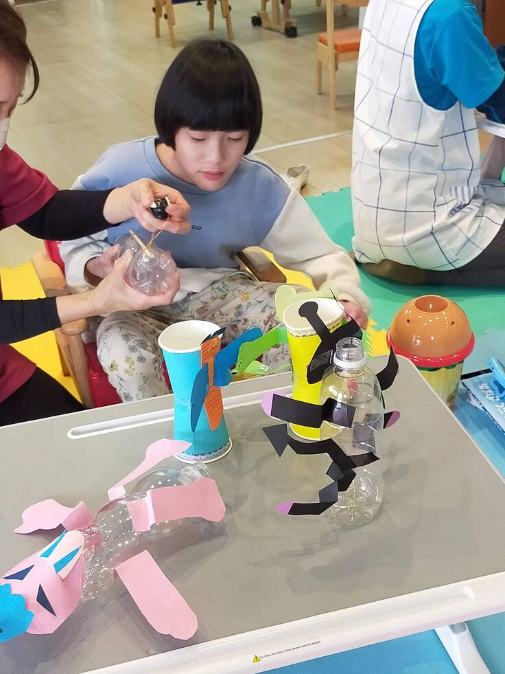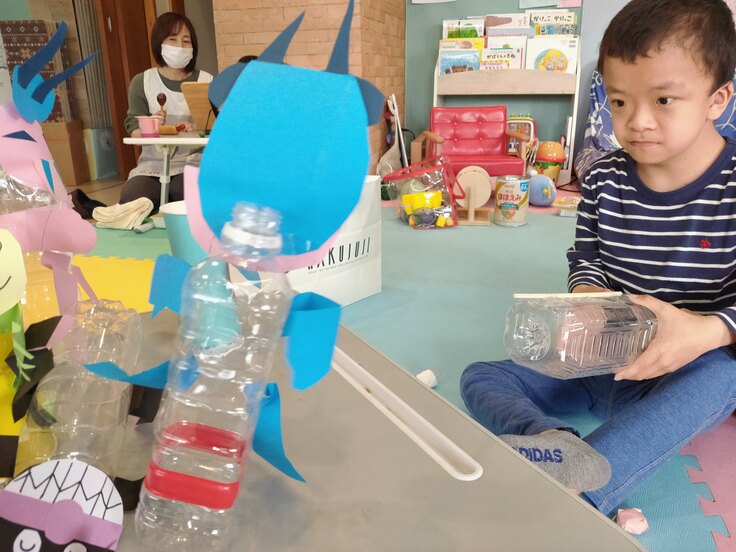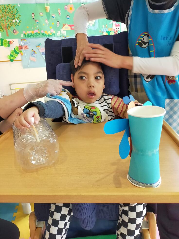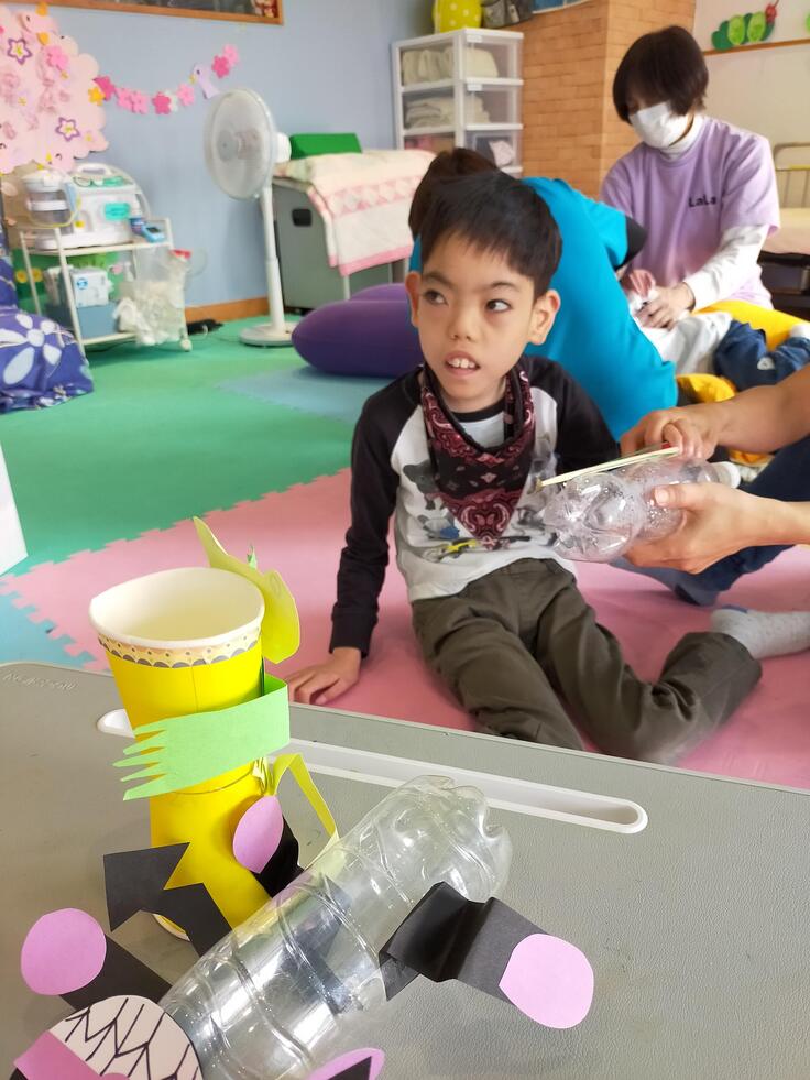 ティッシュを丸めた輪ゴムを発射できる、ペットボトルに割り箸をくっつけた発射台を作りました。輪ゴムから指を離すだけで発射できるので、それぞれ得意な方法で遊ぶことが出来ました。