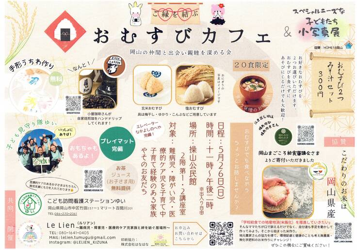 このたび、「難病児、障がい児、医療的ケア児を子育て中、子育て経験のある家族やそのお友だち」を対象として2024年5月26日11:00-14:00に「おむすびカフェ」を岡山市中区にある操山公民館で開催されるとのことです。