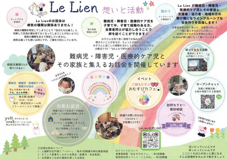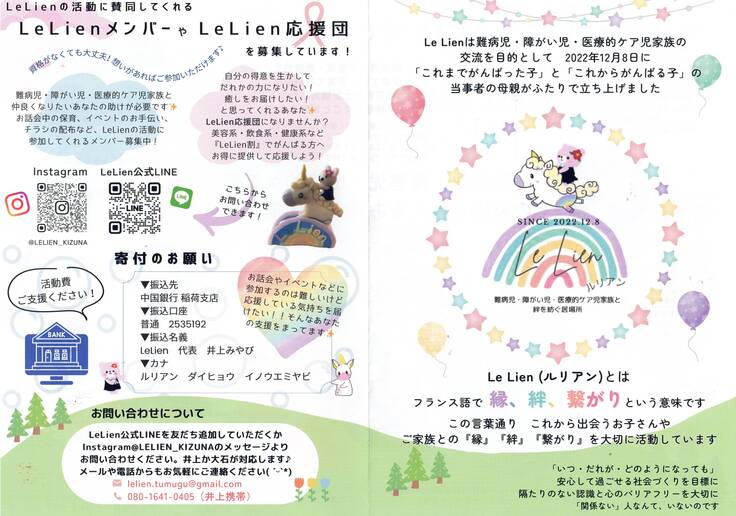 ルリアンさんは、『-難病児・障害児・医療的ケア児家族と絆を紡ぐ居場所-』を創る為に、お話会や各種イベントを定期的に開催されている団体さまです。