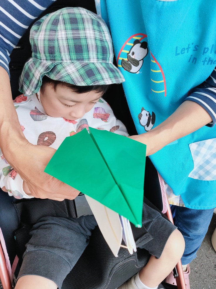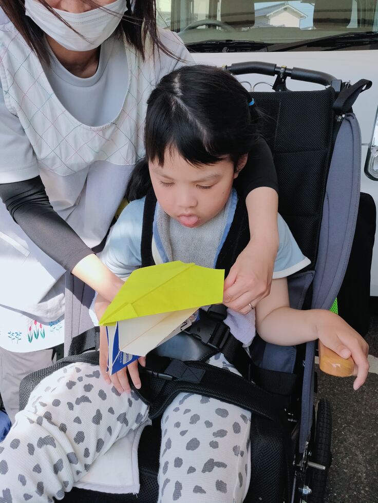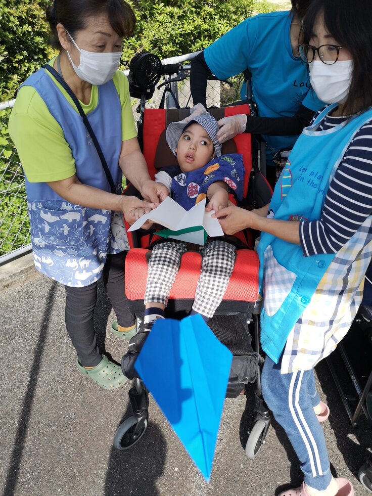 ここに好きな紙飛行機をセットして、輪ゴムを放すと…すごいスピードで空に飛んでいきました(^^)