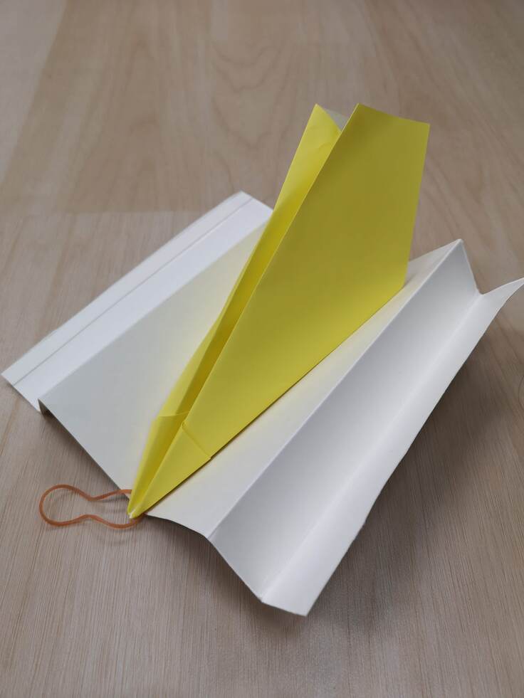 紙飛行機を自分の手で飛ばせるように、牛乳パックと輪ゴムで発射台を作りました。