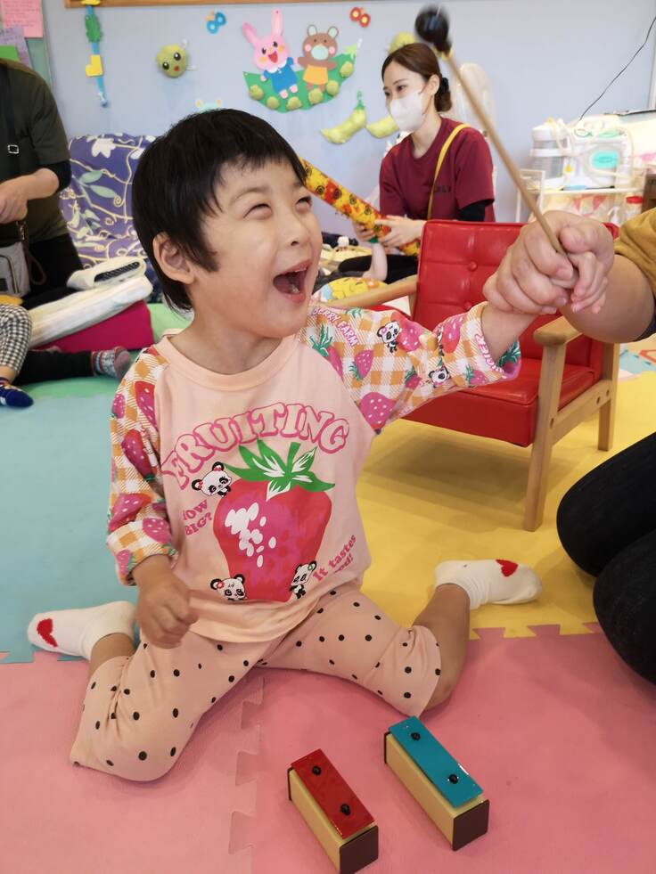 初めてのことが苦手で、先週も緊張した顔で座っていましたが、先生が小さい鉄琴で「あめあめふれふれ」の歌をひいたときその女の子は立ち上がって、鉄琴を持った先生を追いかけていました。それをきっかけにどんどん笑顔になって、最後は他の友達と笑顔で「エビカニクス」を踊ることができました!