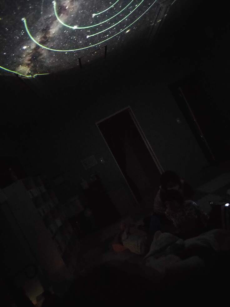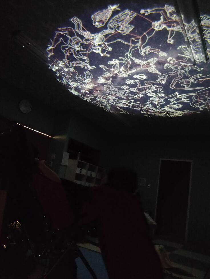 「フライングプラネタリウム」とは、天井に投影できるプロジェクターを使用して、いつでもどこでも星空を体験することができるプログラムです。