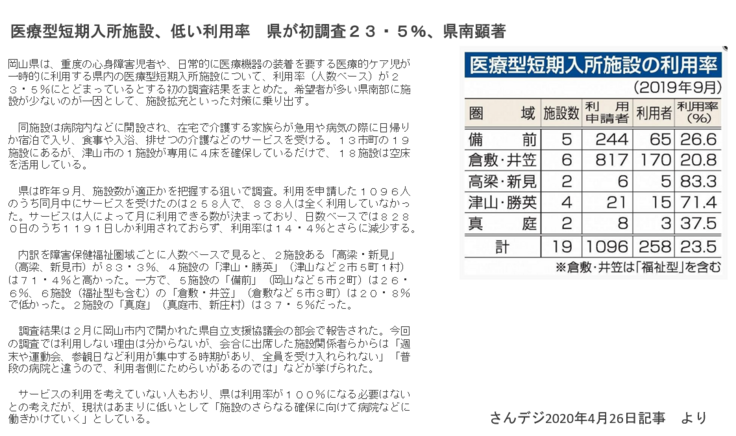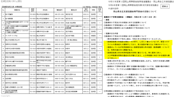 岡山県内には19か所もの医療型ショートステイ施設がありますが、資料の通り、利用実績のない施設、人工呼吸器など、特定の医療的ケアには対応していない等、十分に受け入れ体制が整っていない施設も実は存在するようです。