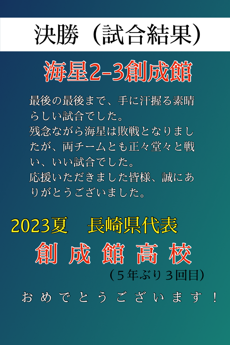 優勝した創成館高校の皆様おめでとうございます。甲子園でのご活躍をお祈り申し上げます。