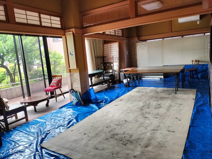 来春1月30日から始まる上野の森美術館での展覧会へ向けて、父・幕田魁心の作品書きが始まっています。自宅、アトリエ、自治会館、鴨川、岩井さじべえ荘と場所を変えて部屋の大きさや空気を変えて作品を書き込みます。美術館でも書きたい!と言う父の希望で夏の終わりまで1階はこのまま、いつ来て書いても良いように準備させていただきます。たぶん年齢的にもここまで大きな展覧会は最後ではないかと思います。思う存分に筆を持たせてあげたいと思います。皆様にはご迷惑をおかけして申し訳ありませんがよろしくお願いいたします。