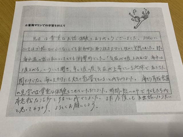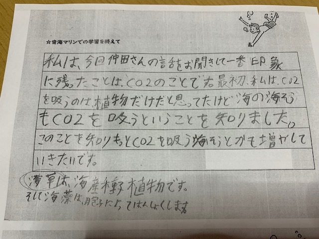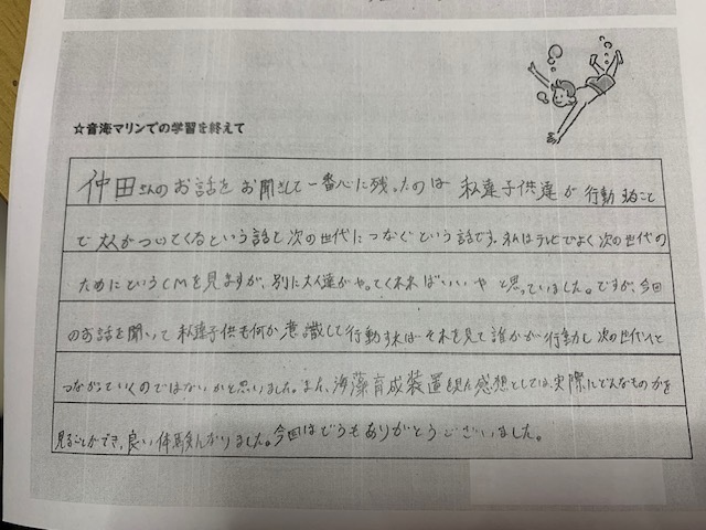 7月上旬に行った、海藻育成(再生)装置を通したSDGsセミナーに、地元の中学校に参加して頂いたときの生徒の感想文を掲載させて頂きます。