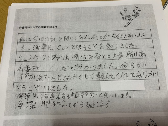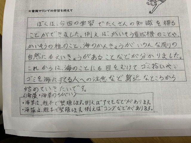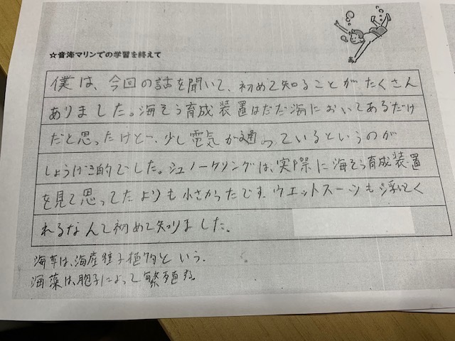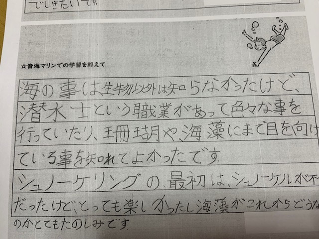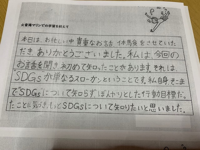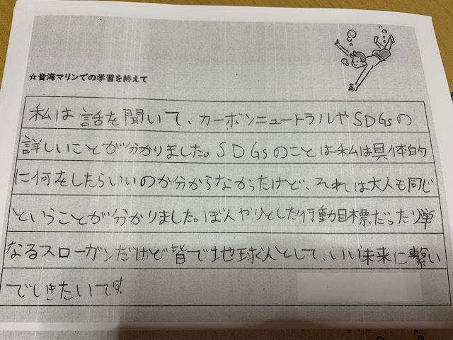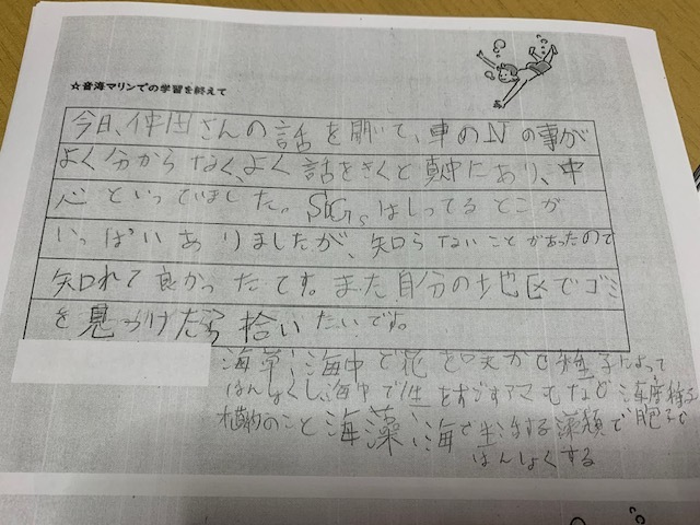 最後に7月に町営の「集落センター」と「音海マリン」でSDGsセミナーと観察会に参加して頂いた中学生の方々の残りの感想文を掲載させて頂きます。