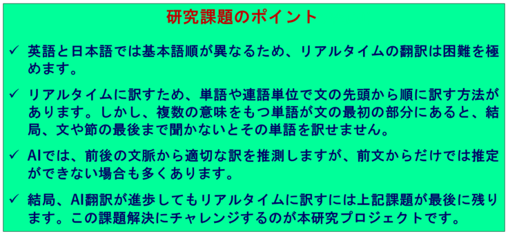 以上の2点が主な問題点です。最近はAIによる翻訳が発達して、かなり正確な訳が可能になっていますが、このような複数の意味を持つ単語の場合、どの意味を採用するかは前後の文脈から判断し、複数の意味に対して訳としての適切性を定量的に(確率で)評価します。したがって、文の先頭近くで現れ、しかもその文の前にも判断を可能する情報が含まれた会話がない場合、AIでは高い確率をもって、訳の候補を選択することができません。本質的な問題は上記1、2で、この問題が解決できれば、英語ネイティブとの円滑なリアルタイムコミュニケーションが可能になると考えています。