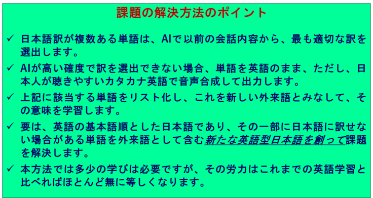 上述のように日本語において複数の意味を有する基本動詞や多義語についてAIでも適切な訳が明確にできない場合は、あえて日本語に訳さず英語のまま音声出力することで、リアルタイム性を優先します。文中に日本語に訳せない単語が含まれていると、文意が掴めないと思われるかもしれませんが、これらの単語の数は数百程度です。したがって、最低限これらの英単語のみ、その意味や単語が持つ概念を知っておけば文の意味も文の終了時に遅延なく理解できるはずです。日本には英語がそのまま日本語になっている外来語が多数ありますが、これらの単語も新たな外来語と考え、日本語のボキャブラリーに加えることにします。したがって、本方法では多少の学びが必要ではありますが、その労力は従来の英語学習と比べればほとんど無に等しいと言ってもいいくらいです。