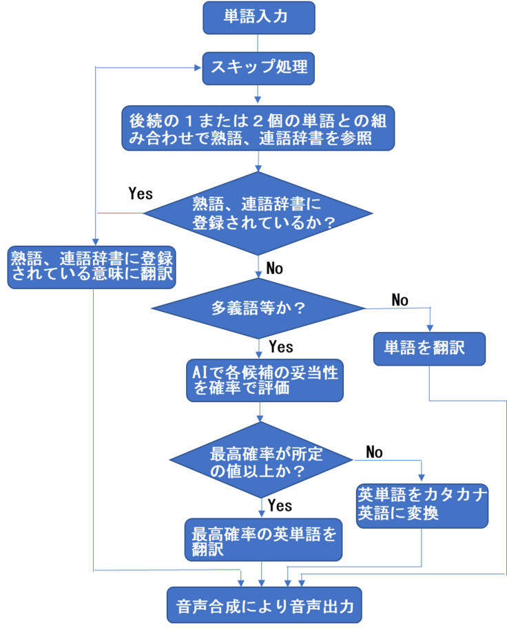 - 上記3において、単語が基本動詞や多義語の場合のように、登録された日本語の訳が複数ある場合は、AIにより、その単語が現れる以前の会話内容から、複数の訳の候補に対して訳としての妥当性を確率で出力し、確率が最高の訳を採用する。