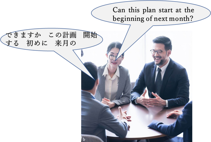 AIが進歩しても英語ネイティブとリアルタイムの会話を実現することは難しいのは、先に述べたように英語と日本語では構造、特に基本語順が異なるためです。そこで、本プロジェクト研究では、英語の基本語順のままで、単語単位、あるいは2,3語からなる熟語やチャンクなどの連語単位で文の先頭から順番に日本語に訳していきます。単語単位(または2,3語からなる連語単位)で訳していきますので、英語の発話からほとんど遅れることなく日本語訳が可能で、円滑なリアルタイムのコミュニケーションが可能となります。このような単語やチャンク単位で英文を文頭から語順のまま文の意味を理解する方法は、英語の速読やリスニングの学習で用いられる方法です。しかし、これは英語を英語のままで文意を理解するための有効な方法ですが、この方法で英文を日本語に訳す場合には以下のような問題が生じます。