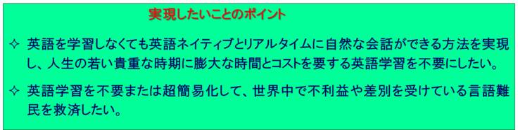 - 将来のグローバルコミュニケーションとは、英語を学ぶことによるものではなく、英語を学ばなくてもコミュニケーションができる方法を推進することだと考えます。
