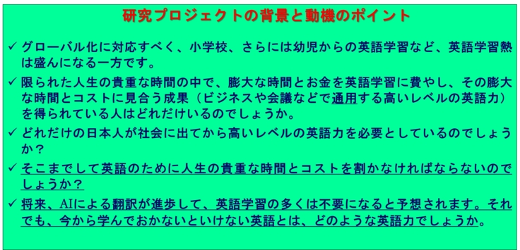 本研究プロジェクトの出発点はこのような英語教育の現状に対する疑問でした。具体的には従来の英語教育に対して次のような疑問を持っています。そして、これらの疑問が本プロジェクトの出発点となっています。