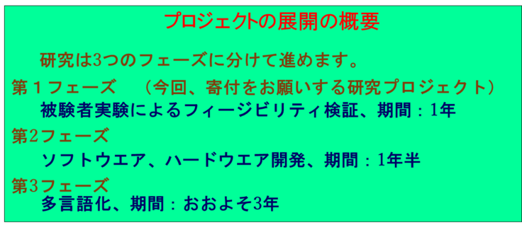 (1)第1フェーズ(今回、寄付を募る研究プロジェクト、内容:フィージビリティ検証、期間:1年)