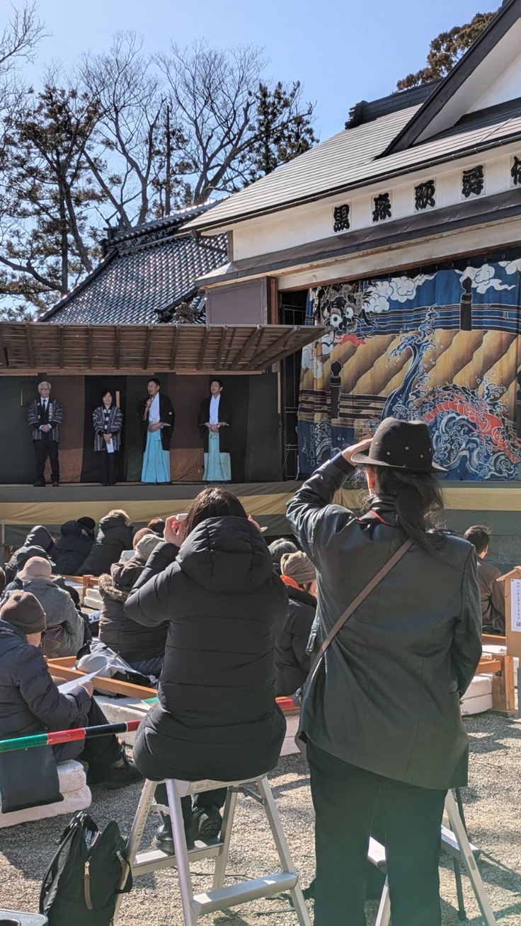 快晴で季節外れの陽気であった本日、酒田市黒森鎮座 日枝神社にて行われました「黒森歌舞伎正月公演」にお邪魔し、クラウドファンディング挑戦の告知と、ご協賛のお願いに行ってまいりました。