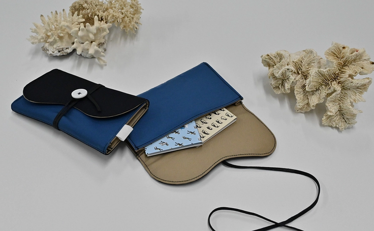 あとは、環境に優しいグッズということで、海ゴミ問題をニュースで見たりする方もいると思うですけど、「廃漁網」という漁師さんが使っていた網をリサイクルで生地にし、制作したポーチもございます。