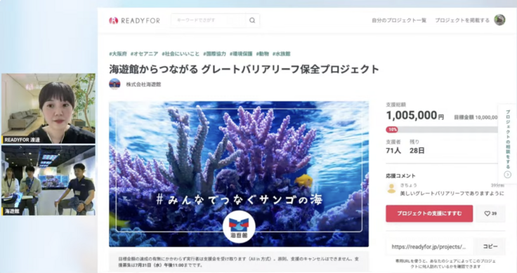 本当に今までの話にあった通り、海遊館だけが支援したり協力したりするんじゃなくて、いろんな方がサンゴだったりサンゴ礁を知ったり、興味を持つきっかけになってほしいな、ということで今回のクラウドファンディングに挑戦してます。