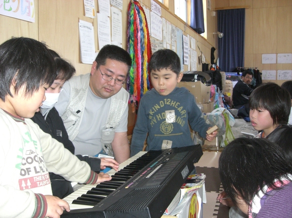 (石巻市の避難所において、子供たちと楽器遊びをしたときの様子です)