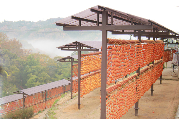 標高300mの山頂に位置するため、一日中日当たりは良く、風が突き抜け、昼夜の寒暖差が大きいこの気候は、霧の影響受けず、干し柿づくりには最適な風土条件が整っています。