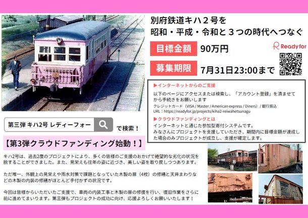 このたび、旧別府鉄道キハ2号を守る会では5月27日より、7月31日まで「別府鉄道キハ2号を昭和・平成・令和と3つの時代をつなぐプロジェクト」第三弾をスタートいたしました。
