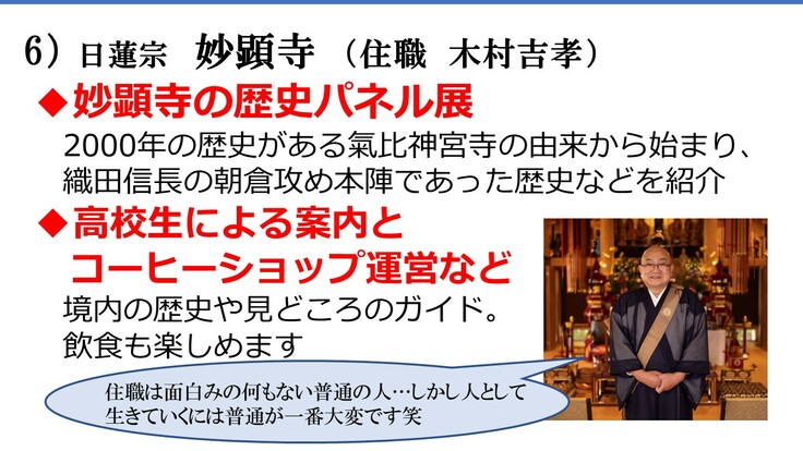 5つの異なる宗派の6か寺が団結したと聞いて、一緒にまちを盛り上げたい!という商店街、市民団体、高校生、歴史倶楽部等の団体、個人の方々が次々と参画。そしてかつて「氣比神宮寺」があったとされる地であり、現在では敦賀を代表する観光地でもある氣比神宮の宮司が顧問を務めるというとてもユニークな団体になっています。