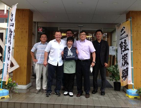 (アンデイ氏の釜石宿泊先となった根浜海岸にある宝来館にて。中央は女将の岩崎さん、両隣がアンディ氏と私です。)